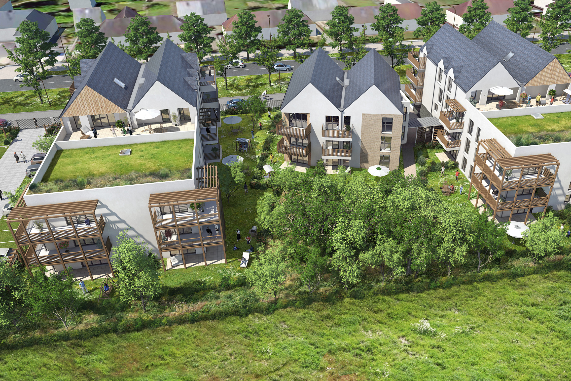 La ZAC du camp des Sablons a pour objet la requalification d’une ancienne friche militaire. C’est un véritable site de renouvellement urbain qui va donner naissance à un quartier de qualité, entre ville et forêt, comme un bois habité. L’opération a fait l’objet d’un appel à projet promoteur – investisseur – architecte pour la cession du lot 2 (co14), qui porte sur la réalisation de 48 logements collectifs en accession à la propriété avec 104 places de stationnement. Il est scindé en 3 immeubles de logements collectifs, qui accueillent respectivement 20, 9 et 19 logements, offrant ainsi des bâtiments à taille humaine. Ces derniers sont écartés les uns des autres, pour aménager deux percées visuelles vers le cœur d’îlot paysagé et la forêt myiawaki placée au centre.